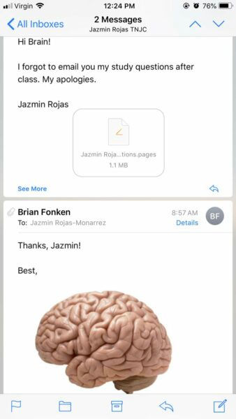 A student Jazmin Rojas got a little late in sending her study questions to her professor who likes to be called with his first name. She made a spelling mistake in the name of her professor Brian Fonken and wrote it ‘Brain’ instead of ‘Brian’ while sending the email; however, she got to realise it only after she received an epic reply from him.